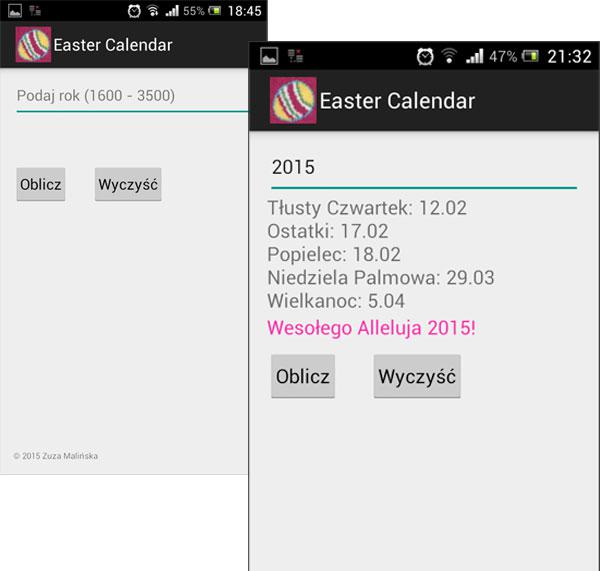 kwiecień 2015Aplikacyjka na Androida stanowiąca wielkanocną kartkę świąteczną 2015 (ale wielokrotnego użytku). Wykorzystałam algorytm udostępniony w materiałach kursu „Initiation à la programmation (en Java)”.