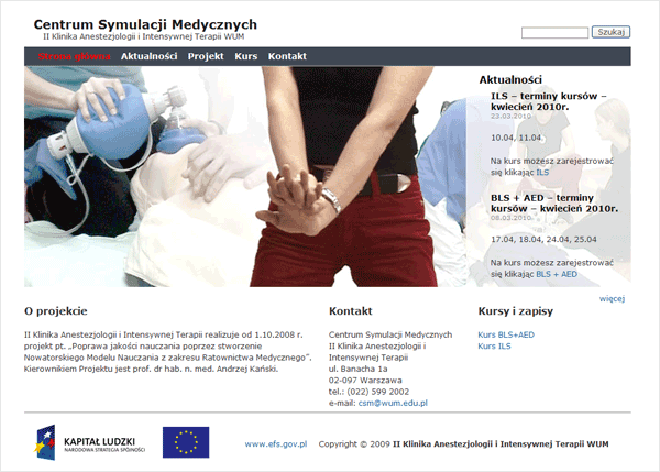 październik 2009Witryna projektu „Poprawa jakości nauczania poprzez stworzenie Nowatorskiego Modelu Nauczania z zakresu Ratownictwa Medycznego”, realizowanego przez II Klinikę Anestezjologii i Intensywnej Terapii Warszawskiego Uniwersytetu Medycznego.