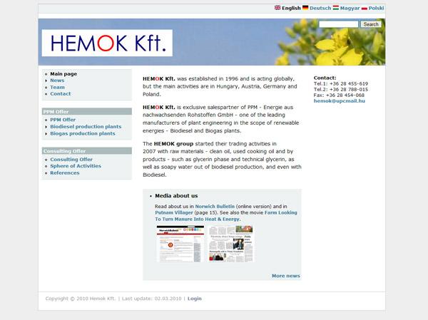 maj 2008Witryna internetowa firmy Hemok Kft. wykonana w systemie CMS Drupal z wykorzystaniem szablonu Foliage. Największym wyzwaniem była wielojęzyczność - witryna ma cztery wersje językowe. Za pomocą switchera języków można się przełączać między różnymi wersjami językowymi tej samej strony.